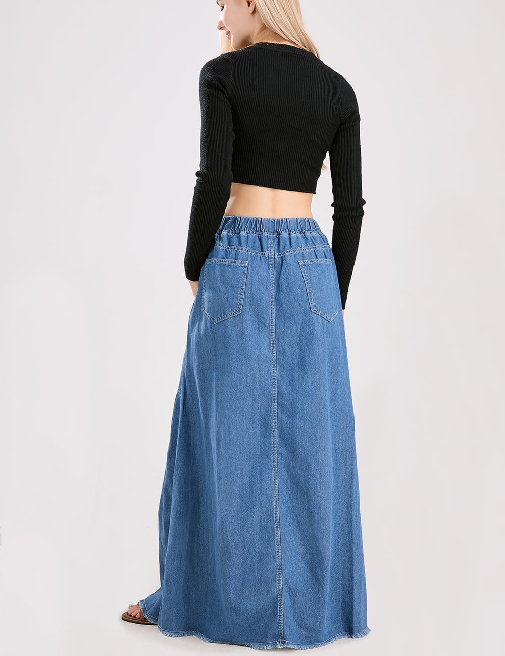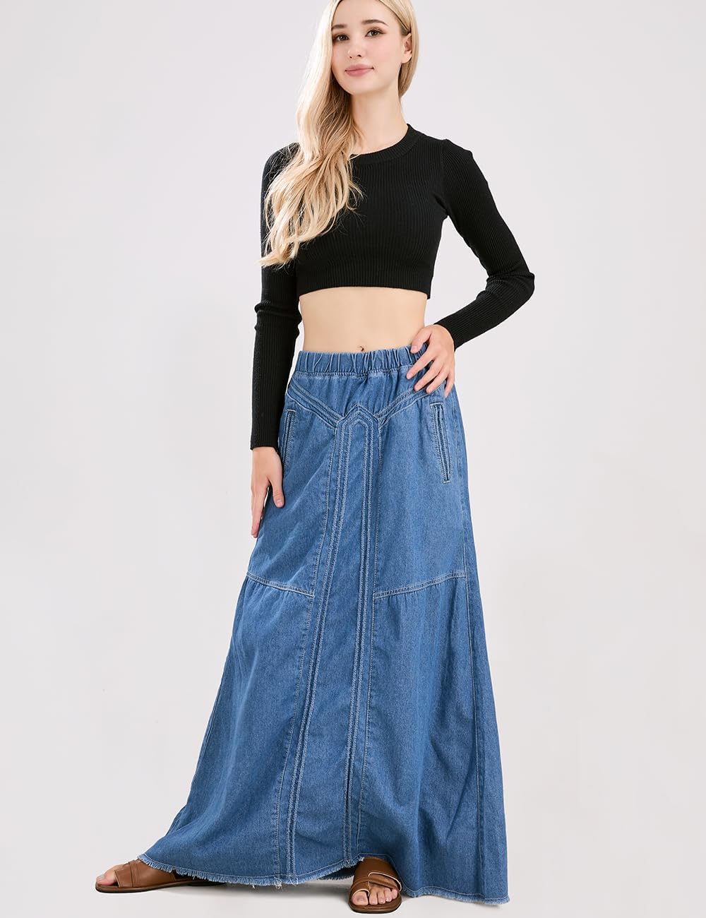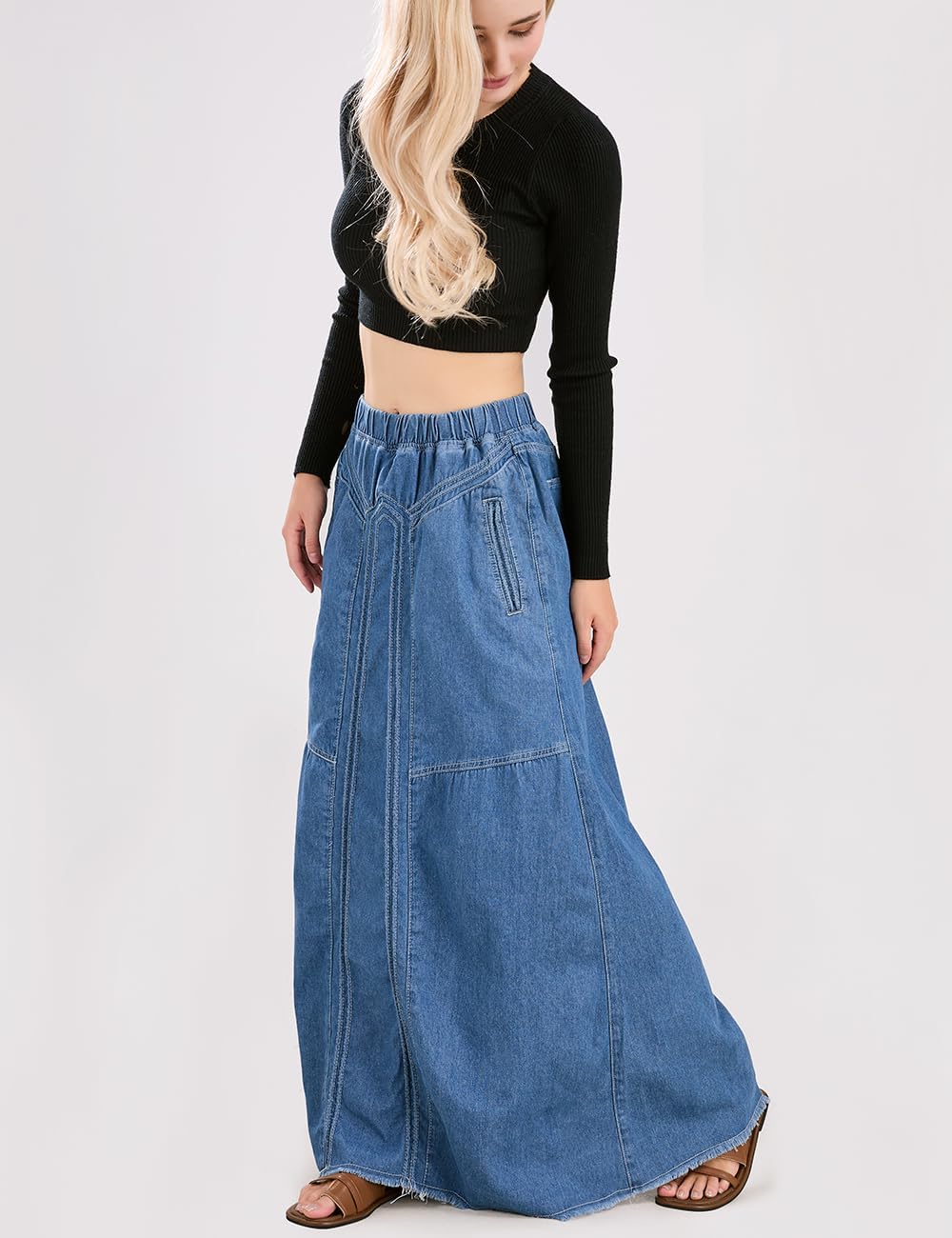 ebossy Women’s Casual Elastic Waist Frayed Hem A-Line Distressed Hippie Long Maxi Denim Skirt
