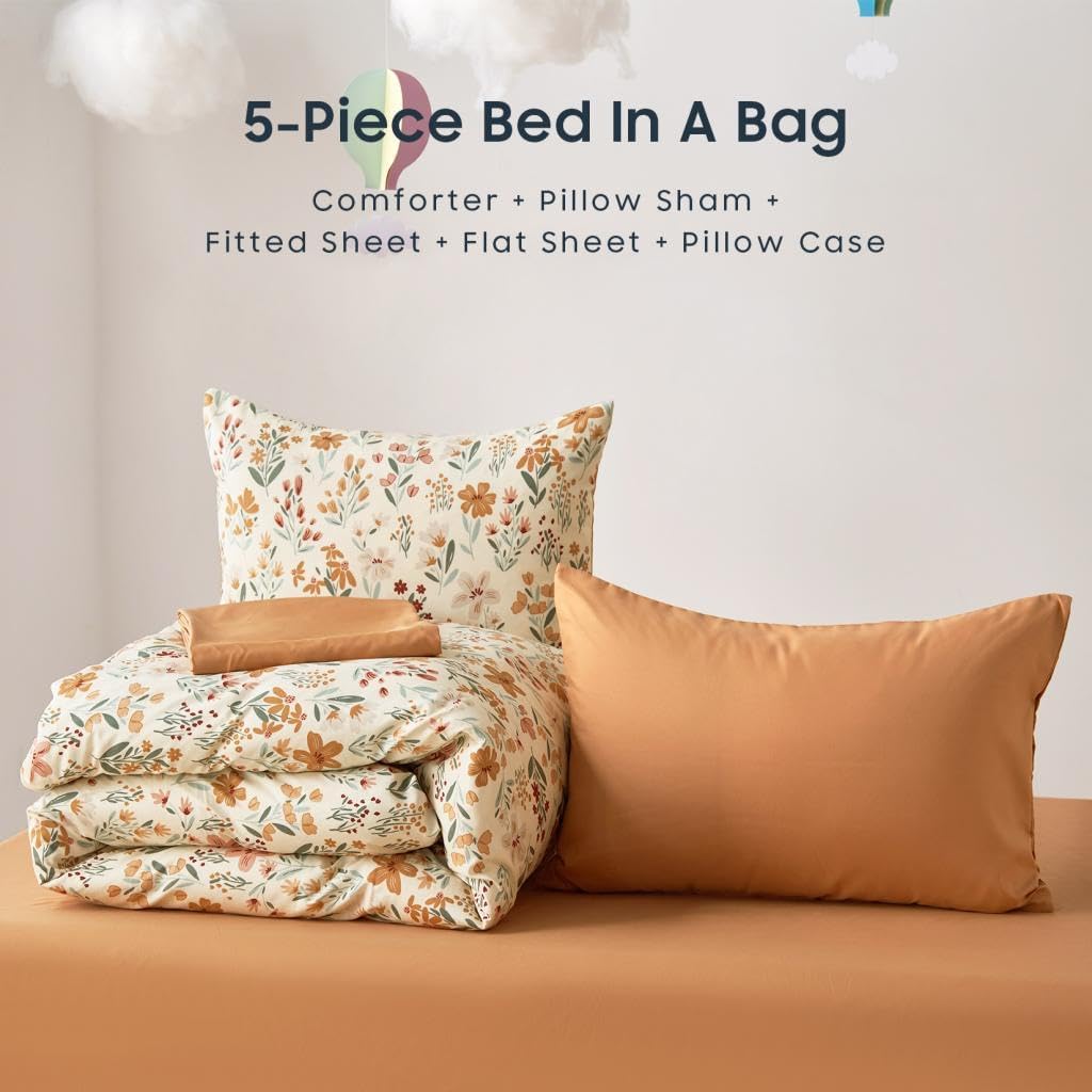 Twin 5 Piece Set: 1 comforter 68″ x 90″, 1 flat sheet 66″ x 96″, 1 fitted sheet 39″ x 75″ +16″, 1 pillowcase 20″ x 26″, 1 pillowcase 20″ x 30″.