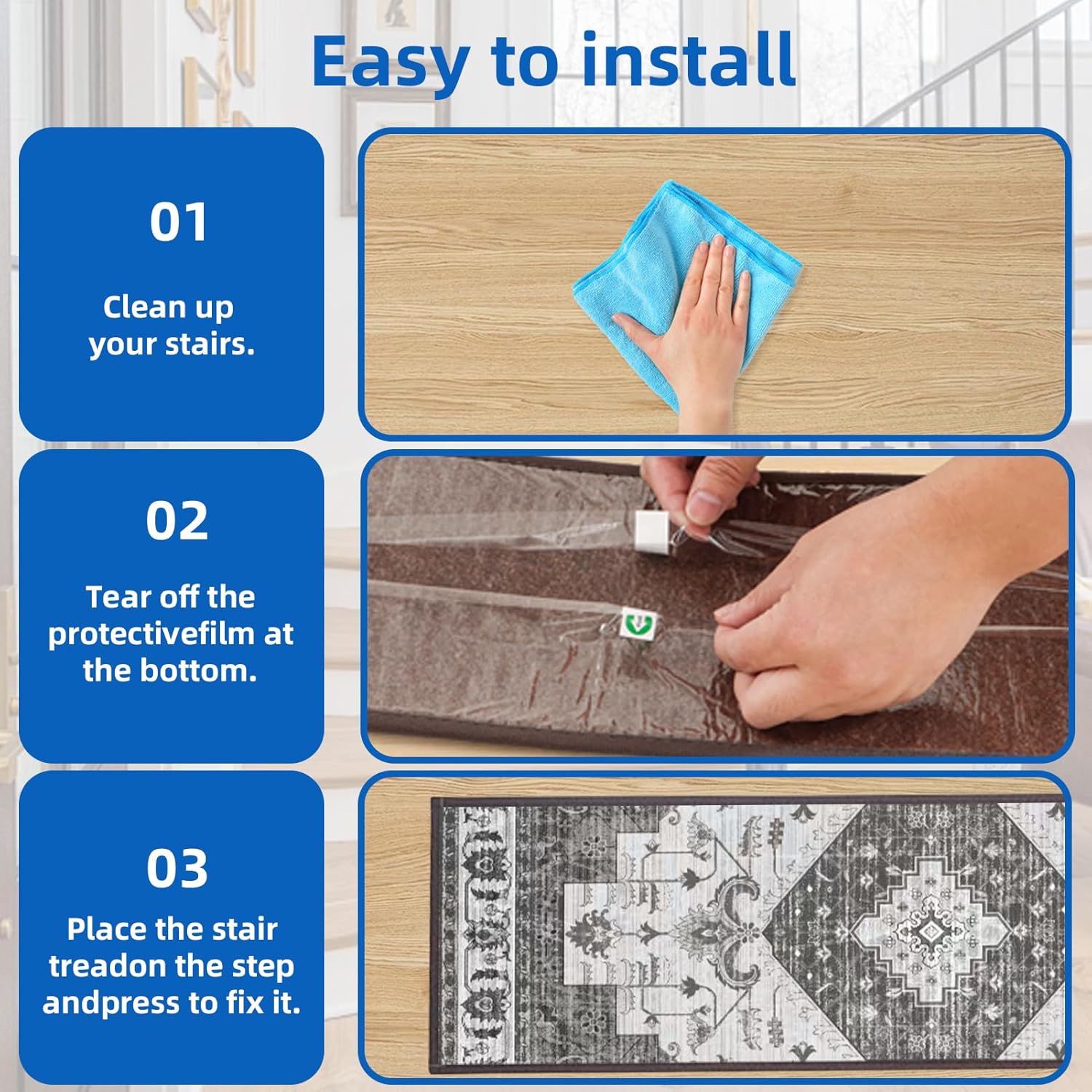 Simple Set up and Elimination Staircase Step Treads: Simply clear, peel, and stick! If it’s worthwhile to reposition or take away,it will not depart any residue,all the time preserving your flooring intact.And it will not take away or slip when assembly water.