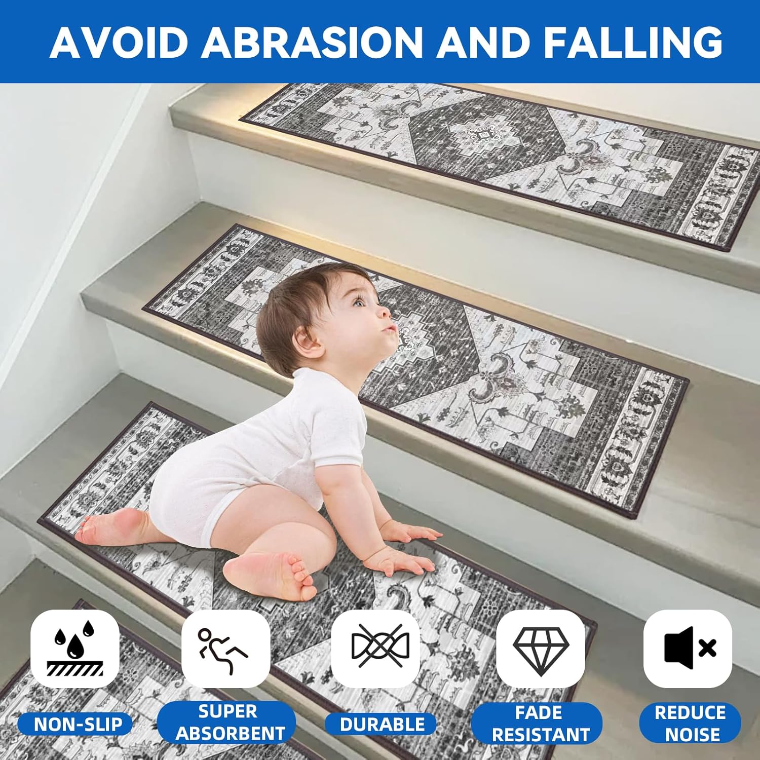 Non Slip Indoor Stair Treads: urable anti slip stair runners use premium chenille materials with 0.25” thickness, the staircase runner carpet for stairs are secure and pleasant for teenagers, elders and pets.