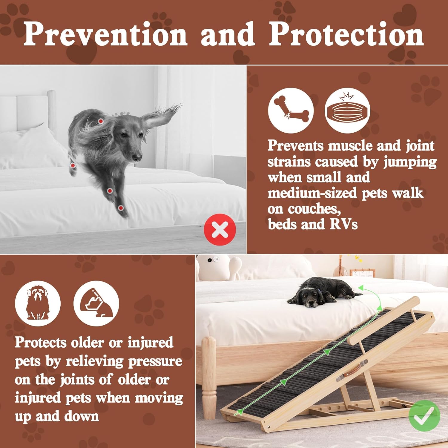 FIVE ADJUSTABLE HEIGHTS: This 44.48 inch adjustable canine ramp is ideal for small to medium sized canines, adjusted in 5 heights of 14.96in – 17.71in – 19.68in – 21.25in – 22.04 in, appropriate for furnishings of all heights.