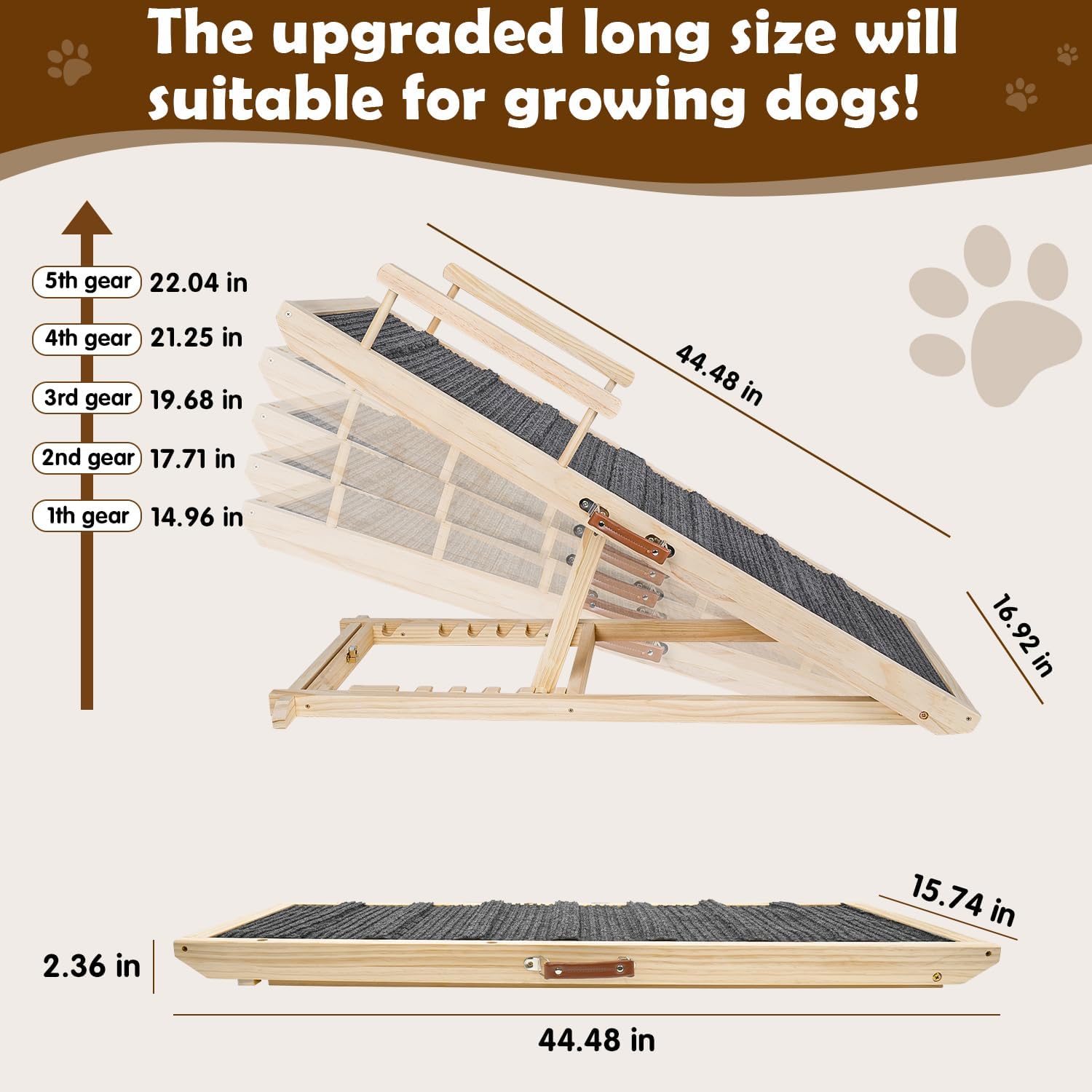 Dog Ramp for Couch, Bed or Car, Wooden 44″ Long Pet Stairs for Small & Large Old Dogs & Cats, Hold up to 200lb, 5 Adjustable Height from 14.96″ to 22″, Portable Doggie Steps, Excellent Traction