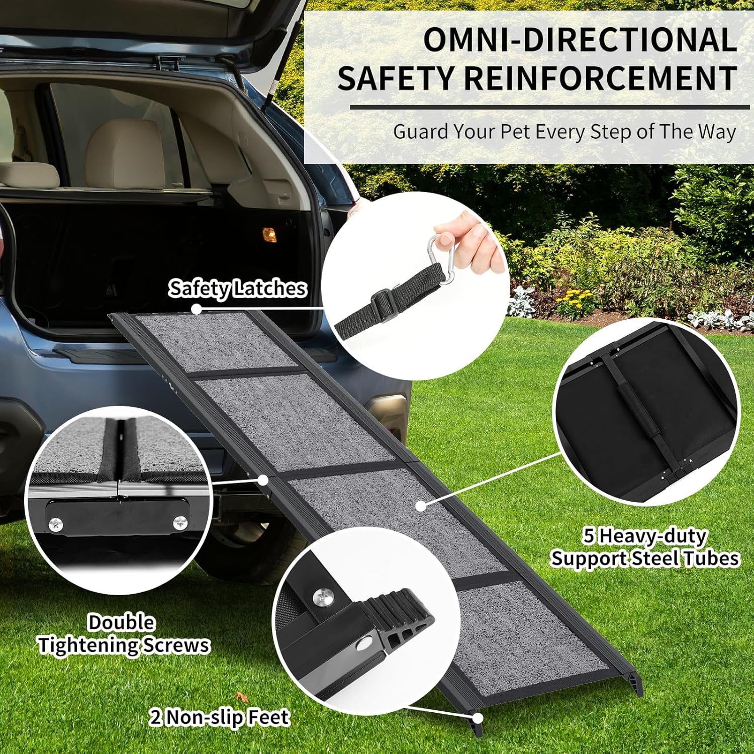 [OMNI-DIRECTIONAL SAFETY REINFORCEMENT] Our pet automobile ramp is fabricated from high-quality steel with double tightening screws on the facet, and 5 heavy-duty help metal tubes on the underside guarantee the security and stability of the ramp, supporting as much as 250 kilos. As well as, the canine automobile ramp comes with security latches to safe it to the again of the car when in use and a pair of non-slip ft for added ramp help, permitting each small and enormous pets to enter and exit the car safely and with out fear.