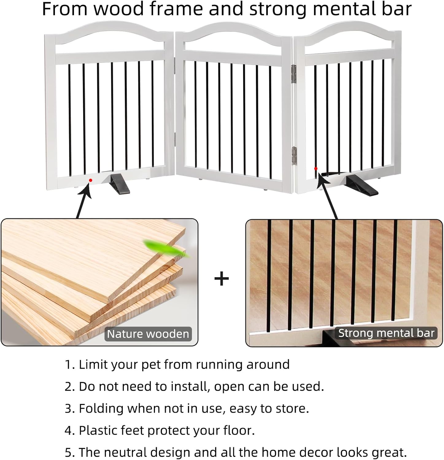 【Easy and Agency】 This convertible panel canine gate is a canine fence, Indoor divider, and pet pen multi functional. mixture of wooden and electroplated metal bars . Non-Slip rubber toes to guard your ground.