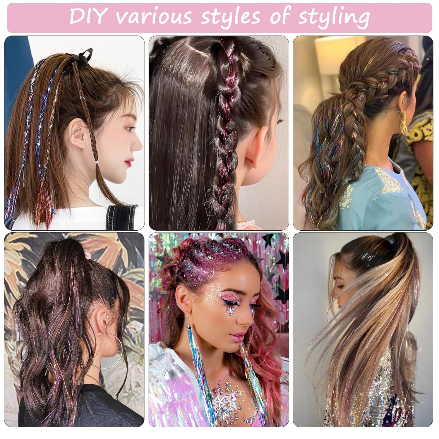 Hair Tinsel Kit, Fairy Tinsel Hair Extensions with Tools – Glitter Hair Tinsel Heat Resistant Accessories for Girls Women Kids Christmas New Year Halloween Cosplay (Hair Tinsel Kit 12 Colors, 43 Inch)