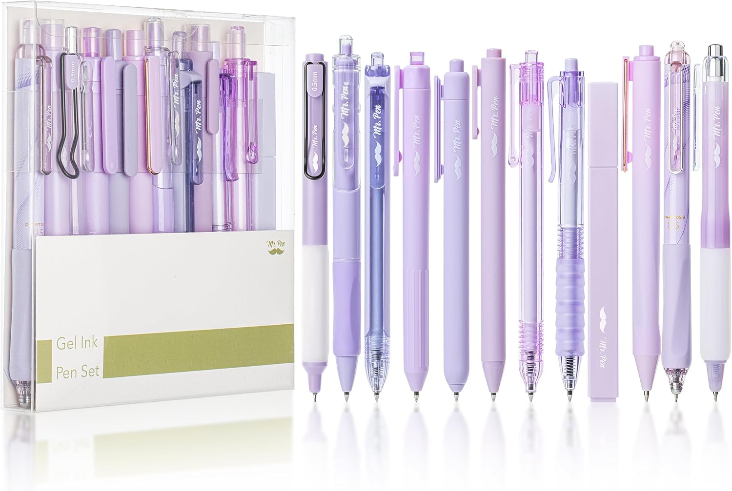 - Mr. Pen gel ink pen set consists of 11 superbly designed pens with elegant pastel purple barrels and 1 matching highlighter for a cohesive and trendy stationery assortment.