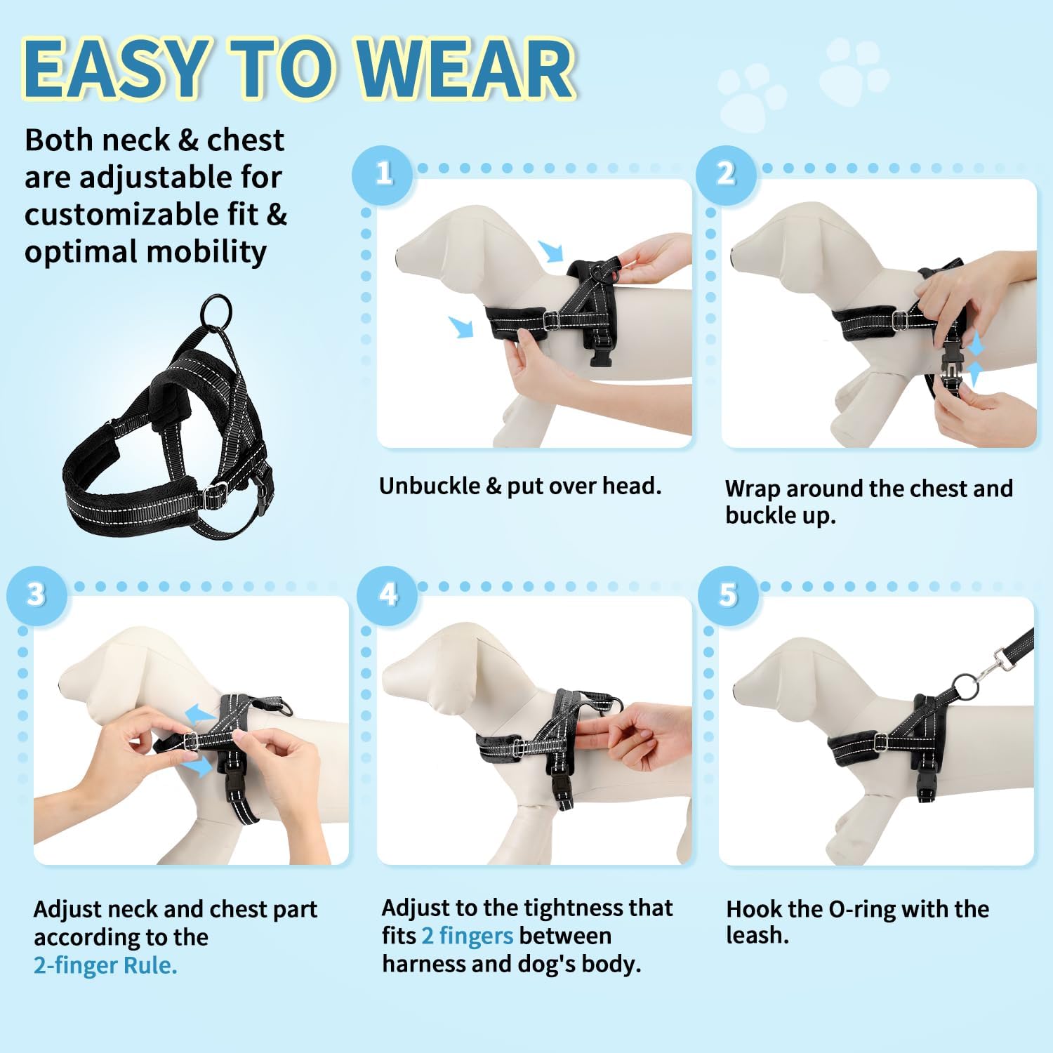 Straightforward On & Light-weight — As a substitute of step-in manner, this halter harness is simple stress free placed on via canine’s head. The one 1 snap buckle on the stomach half make the making use of and eradicating in seconds. Very mild weight materials adopted, even the again metallic D ring, make small canine really feel ease when strolling.