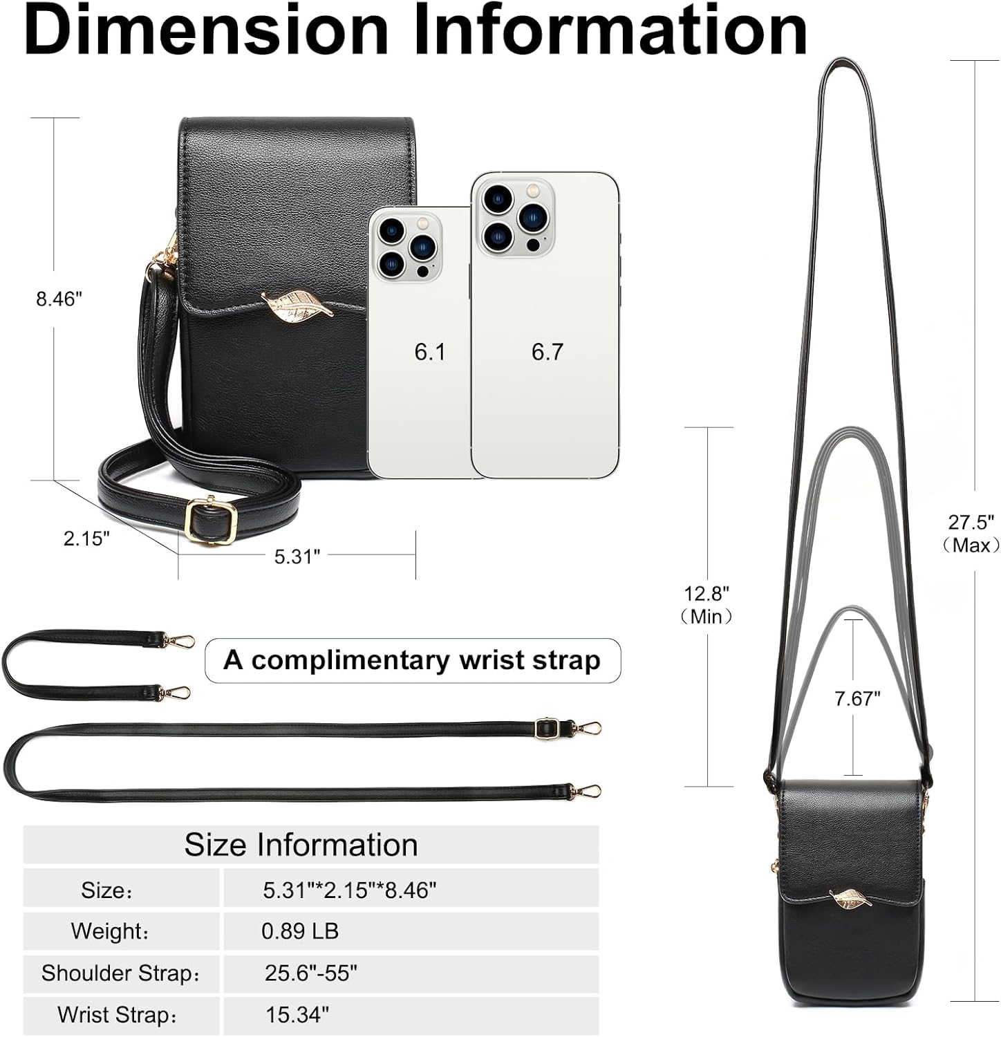 Crossbody pockets dimension: 5.31″ × 2.16″ × 8.46″ (l × b × h)Shoulder strap dimension: 12.8″ to 27.5″ (adjustable and detachable)Cellular phone purse can maintain as much as 6.7″ mobile phone, please measure the dimensions of your mobile phone earlier than buying to keep away from the scenario of not with the ability to retailer it.