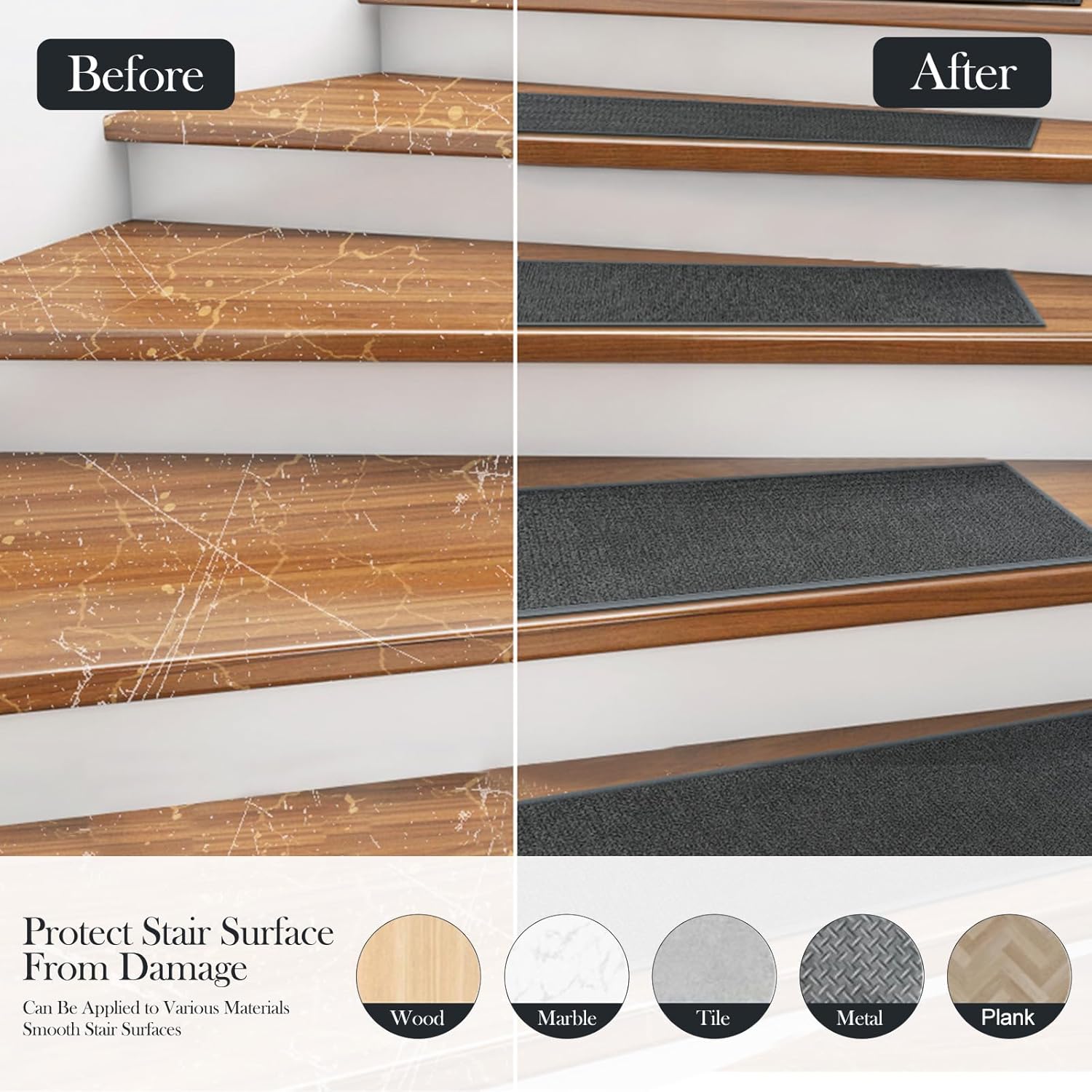 Tender and Sturdy: With a cushty 0.3″ thickness, these carpet stair treads for picket steps indoor supply a smooth cushion on your toes, whereas their polyester floor resists each day put on from foot visitors and pet paws, defending your stairs from scratches and scuffs